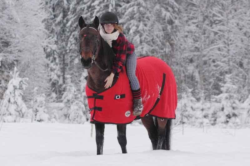 Toinen täydellinen mies oli käymässä ja otti meistä kivoja joulukuvia! Oikeastaan tänään ei ollut edes kylmä päivä, mutta eilen Sotilas näytti punaisessa kuivatusloimessaan niin söpöltä ja jouluiselta, että ajattelin sen kestävän muutaman joulukorttikuvan oton ajan loimitettunakin. Viimeyönä satoi taas lisää lunta ja nyt pellolla saa nostella jalkoja ihan tosissaan. Olen ratsastanut hangessa ilman satulaa viimeksi joskus viime talvena ja homma vaati vähän keskittymistä.. Haha. Älyttömän kivoja kuvia saatiin silti ja jäi hurjan hyvä mieli. (Oikeasti, tiedättekö sen fiiliksen kun tekisi mieli itkeä ilosta kun hevonen tekee jonkun jo ties kuinka kauan hinkatun pikkujutun? Meidän tapauksessa pysähtyy pelkällä istunnalla.)