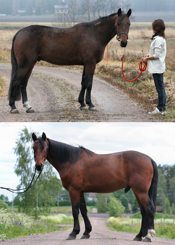 Jälkimmäinen kuva on otettu 21.6.2012 eli kuutta päivää alle kahdeksan kuukautta edellisen jälkeen. Onhan sillä laidunmaha ja vähän ylimääräistä massaa, mut kylkiluut löytyy ja painoa on ulkonäöstä huolimatta todennäköisesti edelleen vähemmän kuin tullessaan. Ei ole hajuakaan, mistä tuo lihas on ilmestynyt, mutta massaa on siinäkin mielessä tullut lisää. Jalat ovat hurjan hyvässä kunnossa, jouhet kasvavat ja karvakin on hyvässä kunnossa nyt kun lopulta vaihtuikin. Muutos on ollut kaikin puolin positiivista, onneksi.