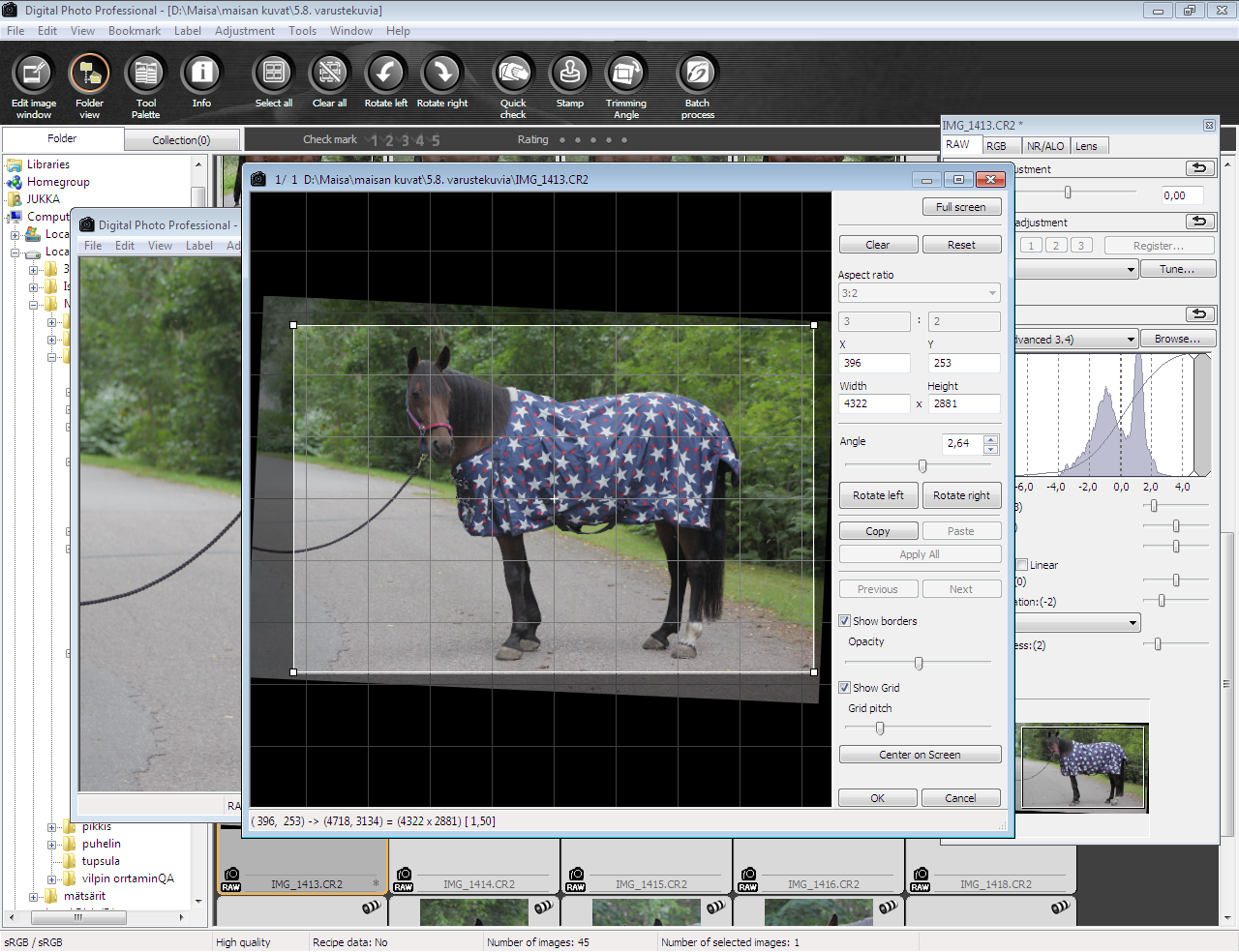 Klikatkaa kuvat suuremmiksi! Olen jo jonkin aikaa kuvannut pelkästään RAW-kuvia, jolloin kaikki kamerassa säädettävät asetukset (kontrasti, värikylläisyys, terävyys jne) ovat muokattavissa jälkeenpäin tietokoneella. Canonin oma Digital Photo Professional on helppo ja näppärä ohjelma kuvien perusmuokkaukseen. Ylläolevista kuvista vasemmanpuoleisessa näkyy kamerassa kuvaushetkellä olleet asetukset. Oikeanpuoleisessa kuvassa rajaustyökalu.