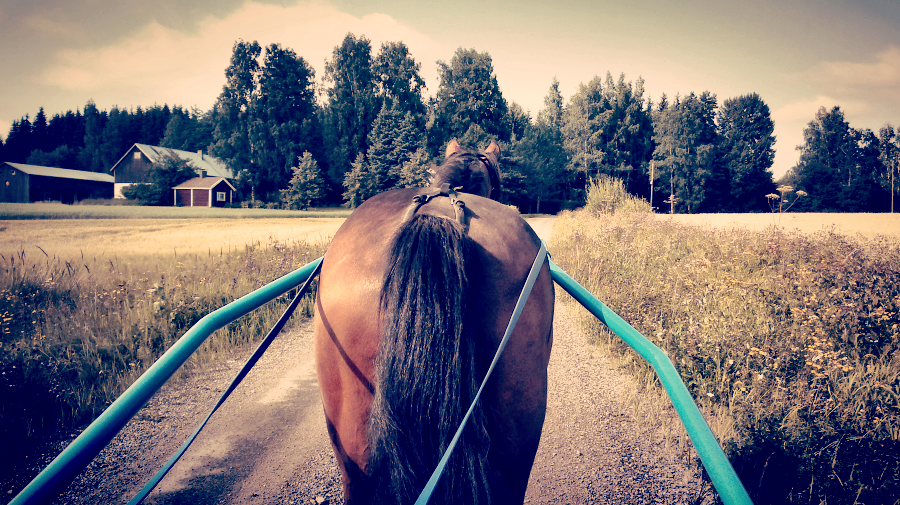Viimepäivinä varsa on päässyt pitkästä aikaa valjaisiin! Kärryillä on kulunut aikaa tuntitolkulla ja illat ovat menneet mukavasti leffojen ja herkkujen kanssa. Roosan seurassa ja vähän överisti tottakai. Toissapäiväisen reissun jälkeen jouduin ottamaan itseäni niskasta kiinni ja soittamaan kengittäjälle - puoliksi irronneen kengän irroittaminen kesken lenkin kaviokoukun, vasaran ja käyttötarkoitukseen täysin sopimattomien pihtien avulla oli metka kokemus, pitkästä aikaa.. Tällä kertaa vain yksi sormi hajosi! Onneksi matkan varrelta löytyy aina apua, kiitti hurjasti! <3 Eikä tarvitse kahta kertaa miettiä kuuluuko hankintalistalle oikeat kengitysvälineet kotitarpeisiin! Sotilaan kanssa on hyvä harjoitella - sen hermot eivät repeä, vaikka kavioidenhoitosessio veisi aikaa.