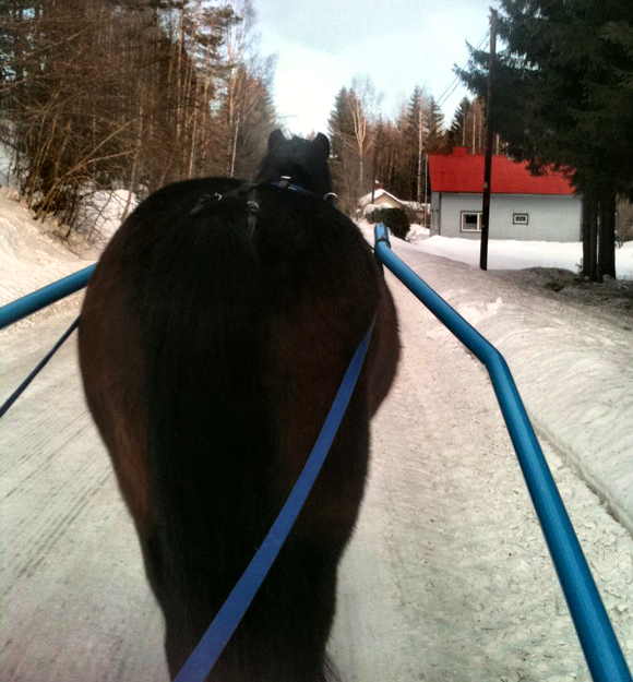 Pennun kanssa kaikkia suuria autoja piti ehdottomasti välttää, koska sen kanssa ei olisi voinut kuvitellakaan pääsevänsä edes ratsain ohi mistään poikkeuksellisen leveästä. Ensin ahtaat paikat ja ohitukset aiheuttivat ikäviä väristyksiä vain hevoselle, mutta vähitellen se takertui kuskinkin takaraivoon jopa siinä määrin, että vielä nykyäänkin vaistomainen reaktio suureen vastaantulijaan on tiukin mahdollinen u-käännös.. Sotilas on tähän mennessä ohittanut mukisematta kaiken lumiauroista metsäkoneisiin, mutta siitä huolimatta minun reaktioni puita lastaavaan ja lähes koko tien levyiseen tukkirekkaan oli aika vahvasti epätoivoinen.. Onneksi en ollut lenkillä yksin ja onneksi kärryjen edessä oli maailman fiksuin hevonen.